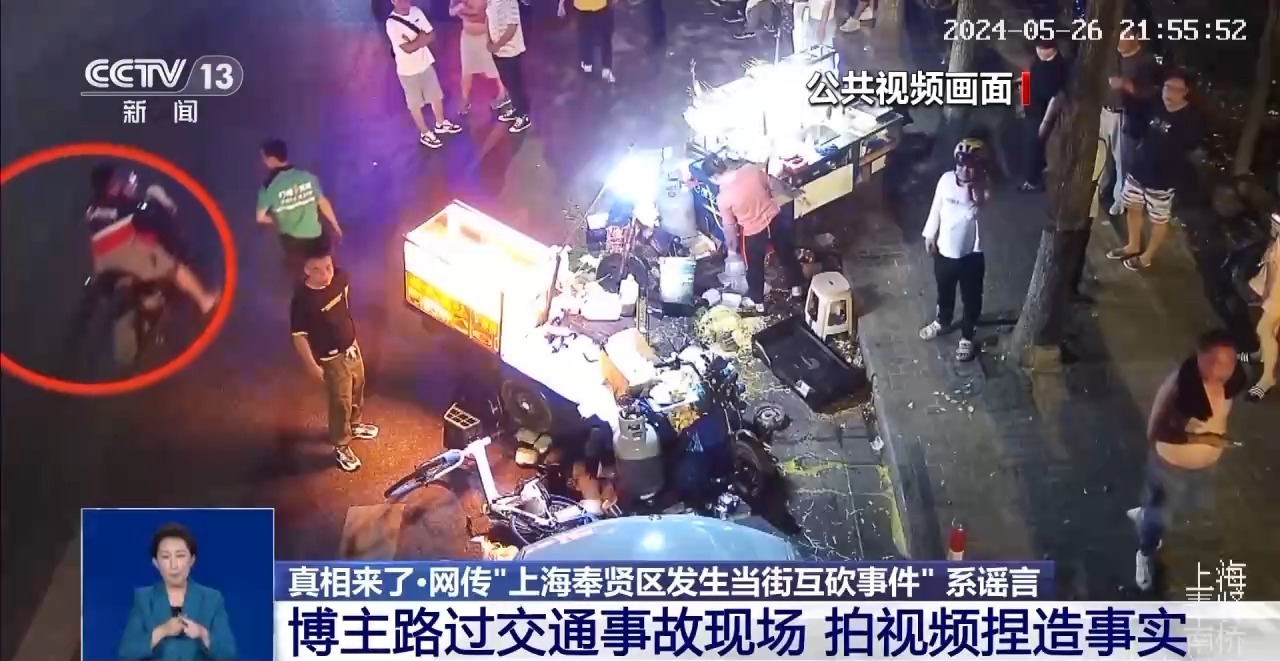 民警核查发现,所谓的“恩怨互砍”事件实际是一起普通交通事故。公共视频显示,5月26日晚上9时40分左右,在上海奉贤区新民旺苑东门处,一辆机动车突然撞向路边的自行车和流动摊贩,导致自行车骑车人受伤流血,流动摊贩的摊位受损。后经警方调查确认,该起交通事故是驾驶员酒后驾驶机动车所致,受伤群众并无大碍。