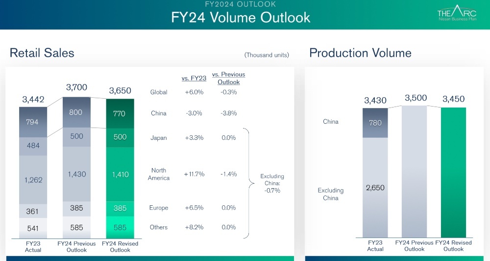 日产预计2024财年营业收入将达到14.0万亿日元(此前预计13.6万亿日元),但其下调了2024财年的营业利润预期和销量预期,营业利润从6000亿日元下调至5000亿日元,预计全年全球汽车销量为365万辆(此前预计370万辆),其中北美销量预计增长11.7%至141万辆,欧洲销量预计增长6.5%至38.5万辆,但中国销量预计将下降3%至77万辆。